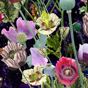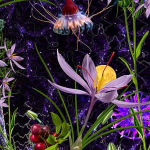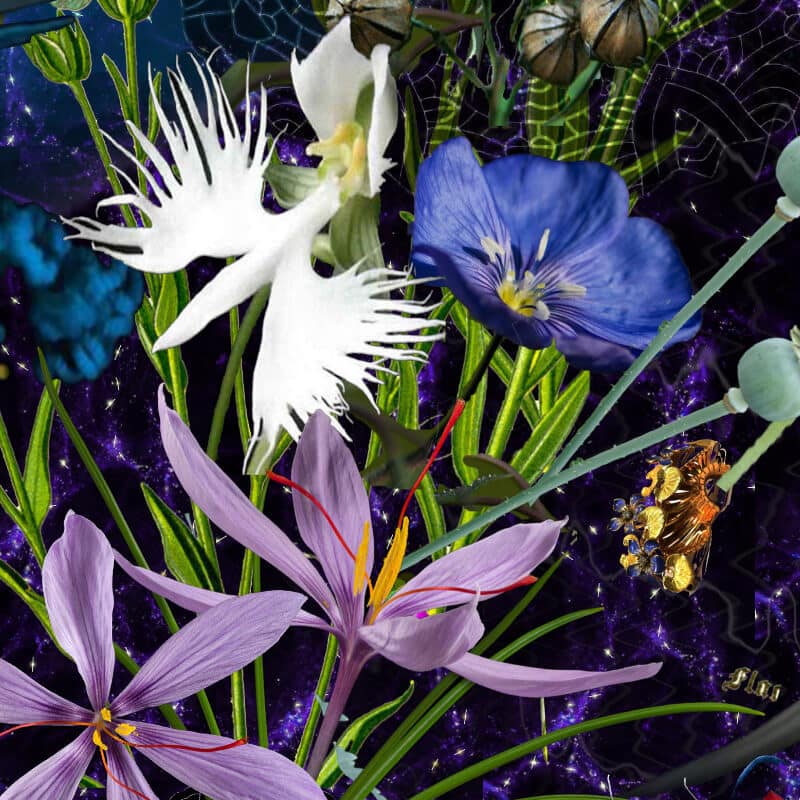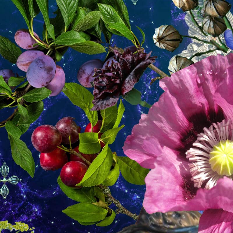Dieses Werk fängt die Essenz einer kosmischen Nacht ein, in der Mohn und Safran in einem betörenden Stillleben erstrahlen. Umgeben von einer Vielfalt an Aphrodisiaka, entfaltet sich ein magisches Farbenspiel, das den Betrachter in eine Welt des Staunens und der Verführung entführt