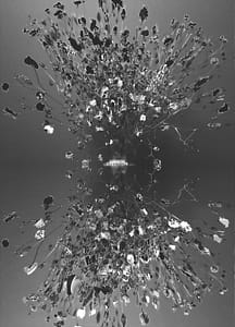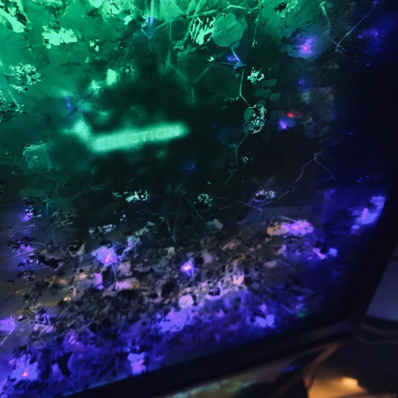 Erlebe „Erection“, ein faszinierendes LED-Schwarzlicht-Wandbild auf holographischer Chrom-Oberfläche. Neon-grüne Teilchen tanzen in einer kraftvollen Explosion von Energie und Dynamik. Die rhythmische Inszenierung fesselt die Blicke und kreiert eine futuristische, pulsierende Atmosphäre.