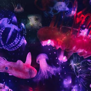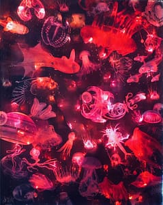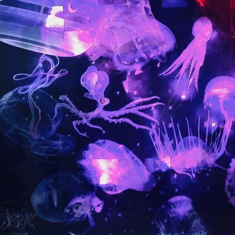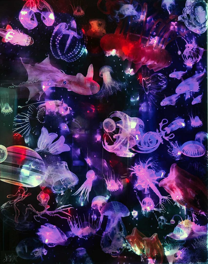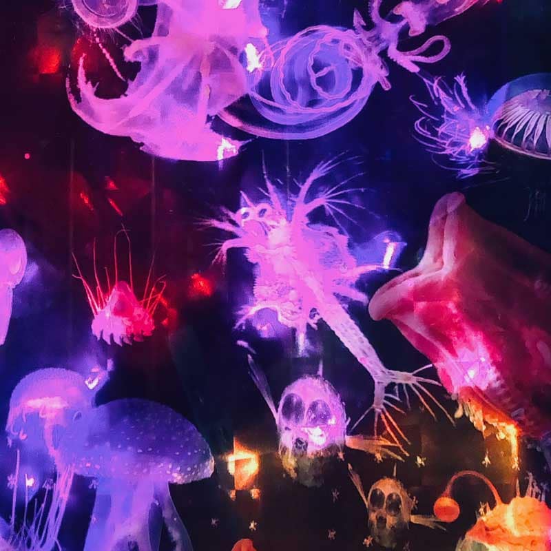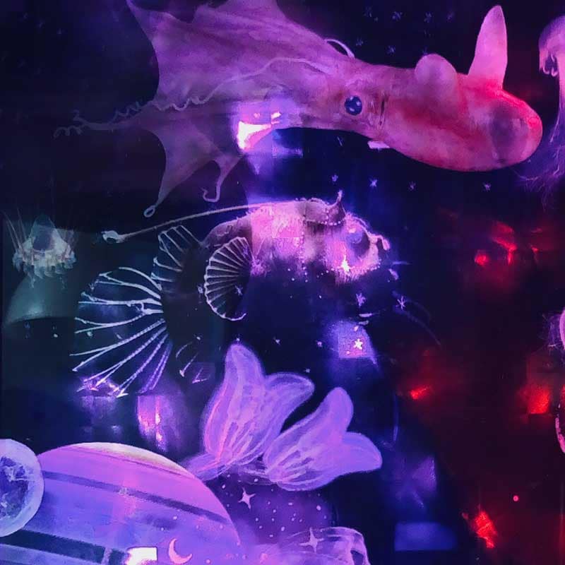 Ozeanische Odyssee – Eine hypnotisierende LED Collage, welche die tiefsten Tiefen des dunklen Ozeans ergründet. Diese LED-Wandbild-Installation entfaltet eine poetische Symphonie aus Licht, Farbe und Ursprünglichkeit, die eine mystische Atmosphäre schafft und die transformative Kraft der Tiefsee in deiner Wunschkomposition floureszieren lässt.